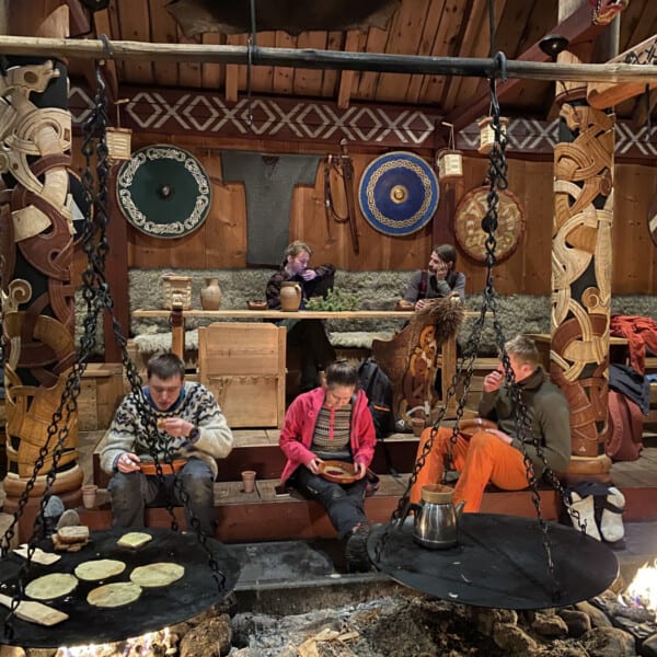 På Stiklestad hender det at vi overnatter i langhuset , og får kjenne på kroppen hvordan det er å lage mat, bo og sove i vikingtid. På Stiklestad møter vi også andre dyktige museumshåndverkere, slik som treskjærer Kai.