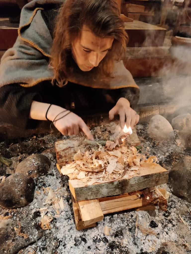 På Middelaldergården Stiklastadir hender det at vi overnatter i langhuset, og får kjenne på kroppen hvordan det er å lage mat, bo og sove i vikingtid. På Stiklestad møter vi også andre dyktige museumshåndverkere slik som treskjærer Kai.